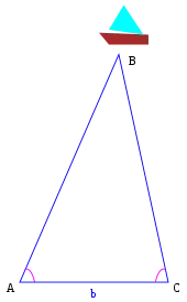 The use of triangles to estimate distances dates to antiquity. In the 6th century BC, about 250 years prior to the establishment of the Ptolemaic dynasty, the Greek philosopher Thales is recorded as using similar triangles to estimate the height of the pyramids of ancient Egypt. He measured the length of the pyramids' shadows and that of his own at the same moment, and compared the ratios to his height (intercept theorem).[3] Thales also estimated the distances to ships at sea as seen from a clifftop by measuring the horizontal distance traversed by the line-of-sight for a known fall, and scaling up to the height of the whole cliff.[4] Such techniques would have been familiar to the ancient Egyptians. Problem 57 of the Rhind papyrus, a thousand years earlier, defines the seqt or seked as the ratio of the run to the rise of a slope, i.e. the reciprocal of gradients as measured today. The slopes and angles were measured using a sighting rod that the Greeks called a dioptra, the forerunner of the Arabic alidade. A detailed contemporary collection of constructions for the determination of lengths from a distance using this instrument is known, the Dioptra of Hero of Alexandria (c. 10–70 AD), which survived in Arabic translation; but the knowledge became lost in Europe until in 1615 Snellius, after the work of Eratosthenes, reworked the technique for an attempt to measure the circumference of the earth. In China, Pei Xiu (224–271) identified "measuring right angles and acute angles" as the fifth of his six principles for accurate map-making, necessary to accurately establish distances,[5] while Liu Hui (c. 263) gives a version of the calculation above, for measuring perpendicular distances to inaccessible places.[6][7]