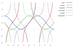 In mathematics, the trigonometric functions (also called circular functions, angle functions or goniometric functions)[1][2] are real functions which relate an angle of a right-angled triangle to ratios of two side lengths. They are widely used in all sciences that are related to geometry, such as navigation, solid mechanics, celestial mechanics, geodesy, and many others. They are among the simplest periodic functions, and as such are also widely used for studying periodic phenomena through Fourier analysis.