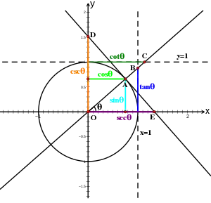 Let be the ray obtained by rotating by an angle θ the positive half of the x-axis (counterclockwise rotation for and clockwise rotation for ). This ray intersects the unit circle at the point The ray extended to a line if necessary, intersects the line of equation at point and the line of equation at point The tangent line to the unit circle at the point A, is perpendicular to and intersects the y- and x-axes at points and The coordinates of these points give the values of all trigonometric functions for any arbitrary real value of θ in the following manner.