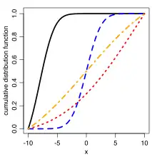 Cumulative distribution function ![]() Cumulative distribution function for the truncated normal distribution for different sets of parameters. In all cases, a = −10 and b = 10. For the black: μ = −8, σ = 2; blue: μ = 0, σ = 2; red: μ = 9, σ = 10; orange: μ = 0, σ = 10. | |||