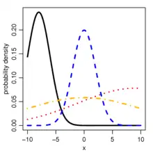 Probability density function ![]() Probability density function for the truncated normal distribution for different sets of parameters. In all cases, a = −10 and b = 10. For the black: μ = −8, σ = 2; blue: μ = 0, σ = 2; red: μ = 9, σ = 10; orange: μ = 0, σ = 10. | |||
