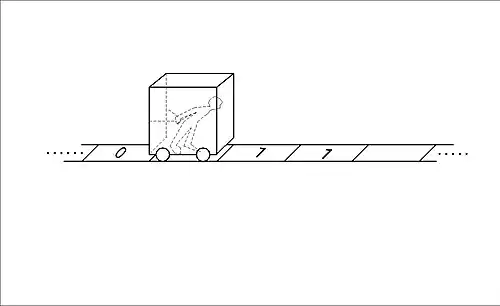 - "We are not concerned with the mechanics or the electronics of the matter. Perhaps the simplest way to picture the thing is quite crudely: Inside the box there is a man, who does all the reading and writing and erasing and moving. (The box has no bottom: the poor mug just walks along between the ties, pulling the box with him.) The man has a list of m instructions written down on a piece of paper. He is in state qi when he is carrying out instruction number i [etc.]" (Boolos and Jeffrey (1974, 1999) p.21)