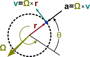 The vector relationships are shown in Figure 1. The axis of rotation is shown as a vector ω perpendicular to the plane of the orbit and with a magnitude ω = dθ / dt. The direction of ω is chosen using the right-hand rule. With this convention for depicting rotation, the velocity is given by a vector cross product as