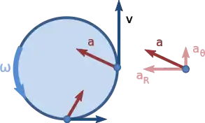 The acceleration of the body can also be broken into radial and tangential components. The acceleration is the time derivative of the velocity: