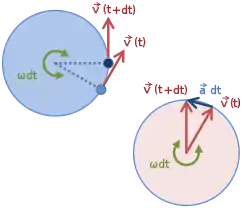 The left-hand circle in Figure 2 is the orbit showing the velocity vectors at two adjacent times. On the right, these two velocities are moved so their tails coincide. Because speed is constant, the velocity vectors on the right sweep out a circle as time advances. For a swept angle dθ = ω dt the change in v is a vector at right angles to v and of magnitude v dθ, which in turn means that the magnitude of the acceleration is given by