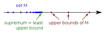 In mathematics, particularly in order theory, an upper bound or majorant[1] of a subset S of some preordered set (K, ≤) is an element of K that is greater than or equal to every element of S.[2][3] Dually, a lower bound or minorant of S is defined to be an element of K that is less than or equal to every element of S. A set with an upper (respectively, lower) bound is said to be bounded from above or majorized[1] (respectively bounded from below or minorized) by that bound. The terms bounded above (bounded below) are also used in the mathematical literature for sets that have upper (respectively lower) bounds.[4]