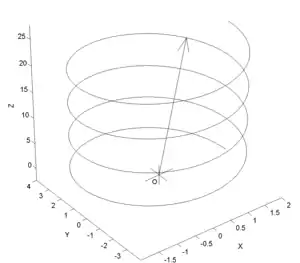 The vector shown in the graph to the right is the evaluation of the function near t = 19.5 (between 6π and 6.5π; i.e., somewhat more than 3 rotations). The helix is the path traced by the tip of the vector as t increases from zero through 8π.