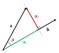 The projection of a onto b can be decomposed into a direction and a scalar magnitude by writing it as where is a scalar, called the scalar projection of a onto b, and b̂ is the unit vector in the direction of b. The scalar projection is defined as[2]