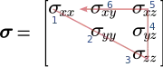 only six components are distinct, the three on the diagonal and the others being off-diagonal. Thus it can be expressed, in Mandel notation,[3] as the vector