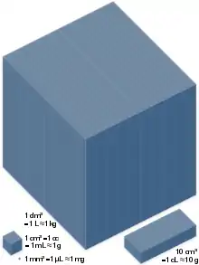 Commonly used prefixes for cubed length units are the cubic millimetre (mm3), cubic centimetre (cm3), cubic decimetre (dm3), cubic metre (m3) and the cubic kilometre (km3). The conversion between the prefix units are as follows: 1000 mm3 = 1 cm3, 1000 cm3 = 1 dm3, and 1000 dm3 = 1 m3.[1] The metric system also includes the litre (L) as a unit of volume, where 1 L = 1 dm3 = 1000 cm3 = 0.001 m3.[18]: 145 For the litre unit, the commonly used prefixes are the millilitre (mL), centilitre (cL), and the litre (L), with 1000 mL = 1 L, 10 mL = 1 cL, 10 cL = 1 dL, and 10 dL = 1 L.[1]