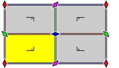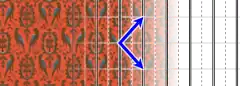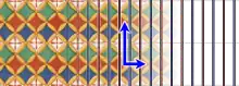 A glide can be represented by one or several arrows if parallel and of same length and same sense, in same way a wallpaper can be represented either by a few patterns or by only one pattern, considered as a pseudo‑tile imagined repeated edge‑to‑edge with an infinite number of replicas. Image 3 shows two patterns with two different contents, and the one in dark dashed lines or one of its images under represents the same wallpaper on the following image 4, by disregarding the colors. Certainly a color is perceived subjectively whereas a wallpaper is an ideal object, however any color can be seen as a label that characterizes certain surfaces, we might think of a hexadecimal code of color as a label specific to certain zones. It may be added that a well‑known theorem deals with colors.