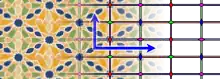 On this page, all repetitive patterns (of minimal area) are constructed from two translations that generate the group of all translations under which the wallpaper is invariant. With the circle shaped symbol ⵔ of function composition, a pair like or generates the group of all translations that transform the Pythagorean tiling into itself.