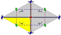 Groups are registered in the catalog by examining properties of a parallelogram, edge‑to‑edge with its replicas. For example its diagonals intersect at their common midpoints, center and symmetry point of any parallelogram, not necessarily symmetry point of its content. Other example, the midpoint of a full side shared by two patterns is the center of a new repetitive parallelogram formed by the two together, center which is not necessarily symmetry point of the content of this double parallelogram. Other possible symmetry point, two patterns symmetric one to the other with respect to their common vertex form together a new repetitive surface, the center of which is not necessarily symmetry point of its content.
