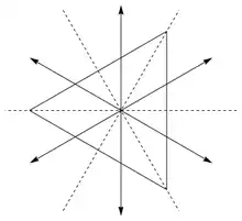 In the case of the root system, for example, the hyperplanes perpendicular to the roots are just lines, and the Weyl group is the symmetry group of an equilateral triangle, as indicated in the figure. As a group, is isomorphic to the permutation group on three elements, which we may think of as the vertices of the triangle. Note that in this case, is not the full symmetry group of the root system; a 60-degree rotation preserves but is not an element of .
