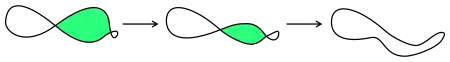 Once one has two opposite double points, one constructs a closed loop connecting the two, giving a closed path in Since is simply connected, one can assume this path bounds a disc, and provided 2m > 4 one can further assume (by the weak Whitney embedding theorem) that the disc is embedded in such that it intersects the image of M only in its boundary. Whitney then uses the disc to create a 1-parameter family of immersions, in effect pushing M across the disc, removing the two double points in the process. In the case of the figure-8 immersion with its introduced double-point, the push across move is quite simple (pictured).