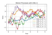In mathematics, the Wiener process is a real-valued continuous-time stochastic process named in honor of American mathematician Norbert Wiener for his investigations on the mathematical properties of the one-dimensional Brownian motion.[1] It is often also called Brownian motion due to its historical connection with the physical process of the same name originally observed by Scottish botanist Robert Brown. It is one of the best known Lévy processes (càdlàg stochastic processes with stationary independent increments) and occurs frequently in pure and applied mathematics, economics, quantitative finance, evolutionary biology, and physics.