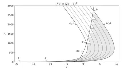 Cavalieri's principle can be used to calculate areas bounded by curves using Riemann–Stieltjes integrals.[13] The integration strips of Riemann integration are replaced with strips that are non-rectangular in shape. The method is to transform a "Cavaliere region" with a transformation , or to use as integrand.