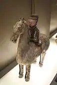 Zhang's long lyrical poems also revealed a great amount of information on urban layout and basic geography. His rhapsody "Sir Based-On-Nothing" provides details on terrain, palaces, hunting parks, markets, and prominent buildings of Chang'an, the Western Han capital.[11][35] Exemplifying his attention to detail, his rhapsody on Nanyang described gardens filled with spring garlic, summer bamboo shoots, autumn leeks, winter rape-turnips, perilla, evodia, and purple ginger.[40] Along with Sima Xiangru (179–117 BC), Zhang listed a variety of animals and hunting game inhabiting the park, which were divided in the northern and southern portions of the park according to where the animals had originally come from: northern or southern China.[41] Somewhat similar to the description of Sima Xiangru, Zhang described the Western Han emperors and their entourage enjoying boat outings, water plays, fishing, and displays of archery targeting birds and other animals with stringed arrows from the tops of tall towers along Chang'an's Kunming Lake.[42] The focus of Zhang's writing on specific places and their terrain, society, people, and their customs could also be seen as early attempts of ethnographic categorization.[43] In his poem "Xijing fu", Zhang shows that he was aware of the new foreign religion of Buddhism, introduced via the Silk Road, as well as the legend of the birth of Buddha with the vision of the white elephant bringing about conception.[44] In his "Western Metropolis Rhapsody" (西京賦), Zhang described court entertainments such as juedi (角抵), a form of theatrical wrestling accompanied by music in which participants butted heads with bull horn masks.[45]