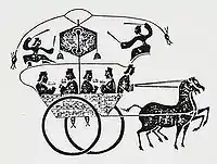 Ancient Chinese texts describe the mechanical carriage's functions; after one li was traversed, a mechanically driven wooden figure struck a drum, and after ten li had been covered, another wooden figure struck a gong or a bell with its mechanically operated arm.[116] However, there is evidence to suggest that the invention of the odometer was a gradual process in Han dynasty China that centered on the "huang men"—court people (i.e. eunuchs, palace officials, attendants and familiars, actors, acrobats, etc.) who followed the musical procession of the royal "drum-chariot".[117] There is speculation that at some time during the 1st century BC the beating of drums and gongs was mechanically driven by the rotation of the road wheels.[117] This might have actually been the design of Luoxia Hong (c. 110 BC), yet by at least 125 the mechanical odometer carriage was already known, as it was depicted in a mural of the Xiao Tang Shan Tomb.[117]