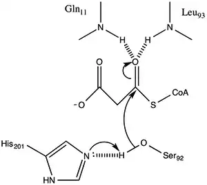 Malonyl-CoA:ACP Transacylase uses a ping-pong kinetic mechanism with a bound malonyl ester as the acyl intermediate attached to a serine residue residing within a GHSLG pentapeptide.[5] FabD first binds malonyl-CoA, the malonyl moiety is then transferred to the active siteSer 92, and CoA is released from the enzyme. ACP then binds and the malonyl moiety is transferred to the terminal sulfhydryl of the ACP prosthetic group. This reaction is readily reversible.[3][6]