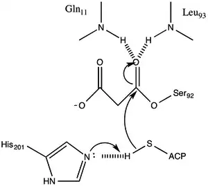 The transfer of malonate to acyl-carrier-protein (ACP) converts the acyl groups into thioester forms which are characteristic of acyl intermediates in fatty acid synthesis and which are strictly required for the condensation reactions catalyzed by β-ketoacyl-ACP synthetase.[4]