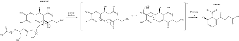 The active site contains a catalytic triad of syrine, histine and arginine, which is conserved across all mutants and is proposed to initiate the reaction.[1] The triad residues are located at Ser86, Asp210, and His232.[5] This triad is proposed to catalyze a proton extraction which triggers a transfer of electrons leading to the elimination of pyruvate and formation of SHCHC.[6] Originally, it was proposed that the transition state was stabilized by a nontraditional oxyanion hole. Now a traditional oxyanion hole is favored, but not definitive.[5]