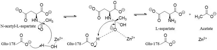 There are two types of possible mechanisms for zinc-dependent hydrolases depending on what is the nucleophile. The first uses deprotonated water and the second attacks with an aspartate or glutamate first forming an anhydride.[14] Aspartoacylase follows the deprotonated water mechanism.[13] Zinc lowers the pKa of a ligated water molecule and the reaction proceeds via an attack on N-acetyl-l-aspartate when the water molecule is deprotonated by Glu-178.[5] This leads to a tetrahedral intermediate that is stabilized by the zinc, Arg-63, and Glu-178.[13] Finally, the carbonyl is then reformed, the bond with nitrogen is broken, and the nitrogen is protonated by the proton taken by Glu-178 all in one concerted step.[14]