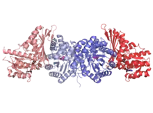 ![]() Pseudomonas sp. aldolase-dehydrogenase heterotetramer assembly consisting of 4-hydroxy-2-ketovalerate aldolase (blue) and acetaldehyde dehydrogenase (red). PDB: 1NVM[1] | |||||||||