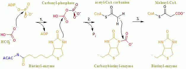 The overall reaction of ACAC(A,B) proceeds by a two-step mechanism.[8] The first reaction is carried out by BC and involves the ATP-dependent carboxylation of biotin with bicarbonate serving as the source of CO2. The carboxyl group is transferred from biotin to acetyl CoA to form malonyl CoA in the second reaction, which is catalyzed by CT.