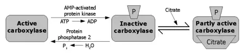 Phosphorylation can result when the hormones glucagon[21] or epinephrine[22] bind to cell surface receptors, but the main cause of phosphorylation is due to a rise in AMP levels when the energy status of the cell is low, leading to the activation of the AMP-activated protein kinase (AMPK). AMPK is the main kinase regulator of ACC, able to phosphorylate a number of serine residues on both isoforms of ACC.[23] On ACC1, AMPK phosphorylates Ser79, Ser1200, and Ser1215. Protein kinase A also has the ability to phosphorylate ACC, with a much greater ability to phosphorylate ACC2 than ACC1. Ser80 and Ser1263 on ACC1 may also serve as a site of phosphorylation as a regulatory mechanism.[24] However, the physiological significance of protein kinase A in the regulation of ACC is currently unknown. Researchers hypothesize there are other ACC kinases important to its regulation as there are many other possible phosphorylation sites on ACC.[25]