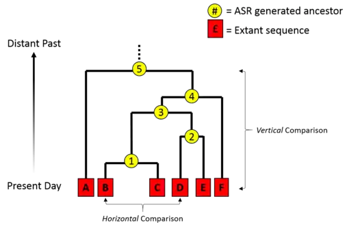 Unlike conventional evolutionary and biochemical approaches to studying proteins, i.e. the so-called horizontal comparison of related protein homologues from different branch ends of the tree of life; ASR probes the statistically inferred ancestral proteins within the nodes of the tree – in a vertical manner (see diagram, right). This approach gives access to protein properties that may have transiently arisen over evolutionary time and has recently been used as a way to infer the potential selection pressures that resulted in present-day sequences. ASR has been used to probe the causative mutation that resulted in a protein's neofunctionalization after duplication by first determining that said mutation was located between ancestors '5' and '4' on the diagram (illustratively) using functional assays.[6] In the field of protein biophysics, ASR has also been used to study the development of a protein's thermodynamic and kinetic landscapes over evolutionary time as well as protein folding pathways by combining many modern day analytical techniques such as HX/MS.[7] These sort of insights are typically inferred from several ancestors reconstructed along a phylogeny – referring to the previous analogy, by studying nodes higher and higher (further and further back in evolutionary time) within the tree of life.[8]