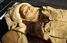 A 2021 genetic study on the Tarim mummies found that they were primarily descended from a population represented by the Afontova Gora 3 specimen (AG3), genetically displaying "high affinity" with it.[71] The genetic profile of the Afontova Gora 3 individual represented about 72% of the ancestry of the Tarim mummies, while the remaining 28% of their ancestry was derived from a population represented by the Baikal EBA (Early Bronze Age Northeast Asian Baikal populations).[71]