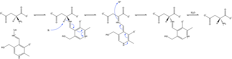 Mammalian aspartate racemase, in contrast with bacterial aspartate racemase, is a PLP-dependent enzyme. The exact mechanism is unknown, but it is hypothesized to proceed similarly to mammalian serine racemase as below: