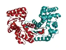 In most bacteria for which the structure is known, aspartate racemase exists as a homodimer,[3] where each subunit has a molecular weight of approximately 25 kDa. The complex consists primarily of alpha helices, and additionally features a Rossmann fold in the center of the dimer. The catalytic pocket lies at the cleft formed by the intersection of the two domains. A citrate molecule can fit inside the binding pocket, leading to a contraction of the cleft to make the "closed form" of aspartate racemase.[4]