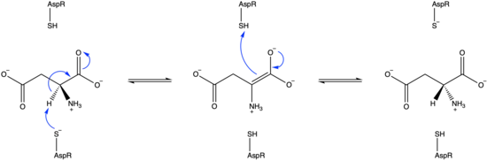 Aspartate racemases in bacteria function in the absence of PLP, suggesting a PLP-independent mechanism.[5] A two-base mechanism is supported in the literature, carried out by two thiol groups: