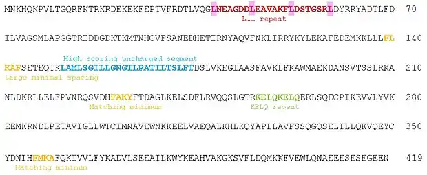 The coded protein is 419 amino acids long and weighs 48.3 kDa.[8] As described in the name, the protein contains a leucine-zipper motif. Four “L……” repeats are present in the beginning, giving rise to the characteristic leucine zipper helix within the 3D structure. An eIF5C domain follows the leucine motif, which is a part of proteins that are important for strict regulation of cellular processes.[9]