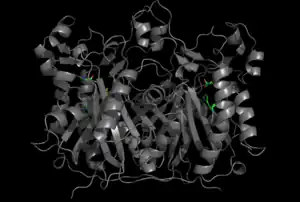 The catalytic activity and substrate specificity of mtFabH has been measured[13] then further probed using crystallographic and directed mutagenesis methods.[14] Structures have been determined of ecFabH bound with substrates, (CoA, malonyl CoA, degraded CoA).[8] Specific inhibitors developed using rational design have recently been reported.[15][16][17] In 2005, the structure of a catalytically disabled mtFabH mutant with lauroyl-CoA was reported.[18]