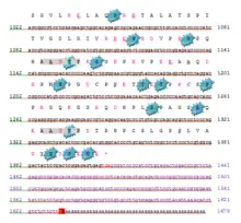 CCDC130 is a heavily phosphorylated protein, with 31 different phosphorylation sites predicted by NetPhos and 26 of those 31 being located in the C-terminal half of the protein.[9] 17 of 22 serines, 4 of 6 threonines, and 2 of 3 tyrosines predicted had probability scores over .800, indicating a high likelihood that they are true phosphorylation sites.[9] There were six sumoylation sites predicted, but only one of these sites (K177) had a probability score of higher than .500, at .640.[10] The physiological function of sumoylation is still relatively mysterious, but this modification can add a substantial amount of molecular weight onto a protein (11 kDa). 13 glycation sites with probability scores over .500 were predicted, and 10 of the 13 glycated lysines occur in the N-terminal half of the protein.[11] NetOGlyc predicted 11 possible O-glycosylationsites with probability scores over .500, with all 11 occurring in a 64 amino acid span running from T313 to T376.[12] Several of these sites were predicted as both phosphorylation sites and O-glycosylation sites. CCDC130 was not predicted to be sulfated,[13] acetylated,[14] myristoylated,[15] N-glycosylated,[16] C-mannosylated,[17] or undergo any GPI modification.[18]