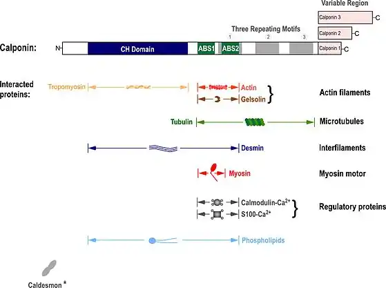 In vitro protein binding studies have demonstrated that calponin binds actin[17] and cross-links actin filaments.[18] Calponin also binds tropomyosin,[19][20] tubulin,[21] desmin,[22][23] Ca2+-calmodulin,[17] Ca2+-S100,[24] myosin,[25] and phospholipids.[26] Calponin also interacts with caldesmon[27] and a-actinin,[28] which however may only reflect their co-localization on actin filaments.[18][29] The variable C-terminal segment regulates actin-binding affinity, and calponin 2 is shown to have the lowest affinity for F-actin among the three isoforms.[30]