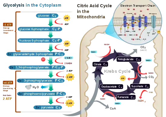 | 2 NADH | 3 or 5 | Oxidative phosphorylation: Each NADH produces net 1.5 ATP (instead of usual 2.5) due to NADH transport over the mitochondrial membrane | |