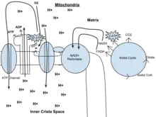 The potential of NADH and FADH2 is converted to more ATP through an electron transport chain with oxygen and protons (hydrogen) as the "terminal electron acceptors". Most of the ATP produced by aerobic cellular respiration is made by oxidative phosphorylation. The energy released is used to create a chemiosmotic potential by pumping protons across a membrane. This potential is then used to drive ATP synthase and produce ATP from ADP and a phosphate group. Biology textbooks often state that 38 ATP molecules can be made per oxidized glucose molecule during cellular respiration (2 from glycolysis, 2 from the Krebs cycle, and about 34 from the electron transport system).[5] However, this maximum yield is never quite reached because of losses due to leaky membranes as well as the cost of moving pyruvate and ADP into the mitochondrial matrix, and current estimates range around 29 to 30 ATP per glucose.[5]
