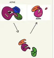 A cyclin-dependent kinase inhibitor protein (also known as CKIs, CDIs, or CDKIs) is a protein which inhibits the enzyme cyclin-dependent kinase (CDK) and Cyclin activity by stopping the cell cycle if there are unfavorable conditions, therefore, acting as tumor suppressors. Cell cycle progression is stopped by Cyclin-dependent kinase inhibitor protein at the G1 phase.[2] CKIs are vital proteins within the control system that point out whether the process of DNA synthesis, mitosis, and cytokines control one another. If a malfunction prevents the successful completion of DNA synthesis during the G1 phase, a signal is sent to delay or stop the progression to the S phase. Cyclin-dependent kinase inhibitor proteins are essential in the regulation of the cell cycle. If cell mutations surpass the cell cycle checkpoints during cell cycle regulation, it can result in various types of cancer.[3]