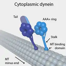 Cytoplasmic dynein, found in all animal cells and possibly plant cells as well, performs functions necessary for cell survival such as organelle transport and centrosome assembly.[1] Cytoplasmic dynein moves processively along the microtubule; that is, one or the other of its stalks is always attached to the microtubule so that the dynein can "walk" a considerable distance along a microtubule without detaching.