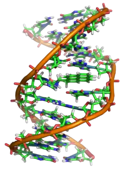 DNA is a long polymer made from repeating units called nucleotides.[6][7] The structure of DNA is dynamic along its length, being capable of coiling into tight loops and other shapes.[8] In all species it is composed of two helical chains, bound to each other by hydrogen bonds. Both chains are coiled around the same axis, and have the same pitch of 34 ångströms (3.4 nm). The pair of chains have a radius of 10 Å (1.0 nm).[9] According to another study, when measured in a different solution, the DNA chain measured 22–26 Å (2.2–2.6 nm) wide, and one nucleotide unit measured 3.3 Å (0.33 nm) long.[10] The buoyant density of most DNA is 1.7g/cm3.[11]