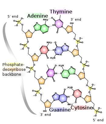 The DNA double helix is stabilized primarily by two forces: hydrogen bonds between nucleotides and base-stacking interactions among aromatic nucleobases.[16] The four bases found in DNA are adenine (A), cytosine (C), guanine (G) and thymine (T). These four bases are attached to the sugar-phosphate to form the complete nucleotide, as shown for adenosine monophosphate. Adenine pairs with thymine and guanine pairs with cytosine, forming A-T and G-C base pairs.[17][18]