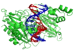 DNA can be twisted like a rope in a process called DNA supercoiling. With DNA in its "relaxed" state, a strand usually circles the axis of the double helix once every 10.4 base pairs, but if the DNA is twisted the strands become more tightly or more loosely wound.[43] If the DNA is twisted in the direction of the helix, this is positive supercoiling, and the bases are held more tightly together. If they are twisted in the opposite direction, this is negative supercoiling, and the bases come apart more easily. In nature, most DNA has slight negative supercoiling that is introduced by enzymes called topoisomerases.[44] These enzymes are also needed to relieve the twisting stresses introduced into DNA strands during processes such as transcription and DNA replication.[45]