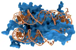 Compared to B-DNA, the A-DNA form is a wider right-handed spiral, with a shallow, wide minor groove and a narrower, deeper major groove. The A form occurs under non-physiological conditions in partly dehydrated samples of DNA, while in the cell it may be produced in hybrid pairings of DNA and RNA strands, and in enzyme-DNA complexes.[54][55] Segments of DNA where the bases have been chemically modified by methylation may undergo a larger change in conformation and adopt the Z form. Here, the strands turn about the helical axis in a left-handed spiral, the opposite of the more common B form.[56] These unusual structures can be recognized by specific Z-DNA binding proteins and may be involved in the regulation of transcription.[57]