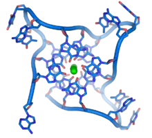 These guanine-rich sequences may stabilize chromosome ends by forming structures of stacked sets of four-base units, rather than the usual base pairs found in other DNA molecules. Here, four guanine bases, known as a guanine tetrad, form a flat plate. These flat four-base units then stack on top of each other to form a stable G-quadruplex structure.[66] These structures are stabilized by hydrogen bonding between the edges of the bases and chelation of a metal ion in the centre of each four-base unit.[67] Other structures can also be formed, with the central set of four bases coming from either a single strand folded around the bases, or several different parallel strands, each contributing one base to the central structure.