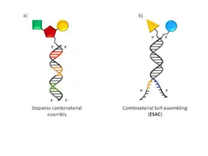 Encoded Self-Assembling Chemical (ESAC) libraries rely on the principle that two sublibraries of a size of x members (e.g. 103) containing a constant complementary hybridization domain can yield a combinatorial DNA-duplex library after hybridization with a complexity of x2 uniformly represented library members (e.g. 106).[18] Each sub-library member would consist of an oligonucleotide containing a variable, coding region flanked by a constant DNA sequence, carrying a suitable chemical modification at the oligonucleotide extremity.[18] The ESAC sublibraries can be used in at least four different embodiments.[18]