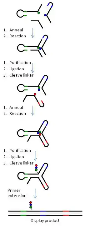 In order to apply combinatorial chemistry for the synthesis of DNA-encoded chemical libraries, a Split-&-Pool approach was pursued.[11][12] Initially a set of unique DNA-oligonucleotides (n) each containing a specific coding sequence is chemically conjugated to a corresponding set of small organic molecules. Consequently, the oligonucleotide-conjugate compounds are mixed ("Pool") and divided ("Split") into a number of groups (m). In appropriate conditions a second set of building blocks (m) are coupled to the first one and a further oligonucleotide which is coding for the second modification is enzymatically introduced before mixing again. This “split-&-pool” steps can be iterated a number of times (r) increasing at each round the library size in a combinatorial manner (i.e. (n x m)r). Alternatively, peptide nucleic acids have been used to encode libraries prepared by "split-&-pool" method.[14] A benefit of PNA-encoding is that the chemistry can be performed by standard SPPS.[15]